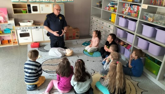 Wizyta Pana Strażnika Miejskiego. Przedszkolaki znają numer alarmowy i widzą co to pierwsza pomoc