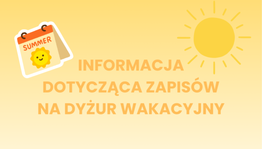 Dyżur wakacyjny jest organizowany od 1 lipca do 31 sierpnia 2026 r. dla dzieci uczęszczających w roku szkolnym 2025/2026 do przedszkoli pr...