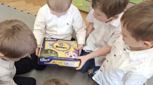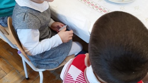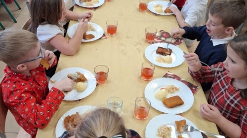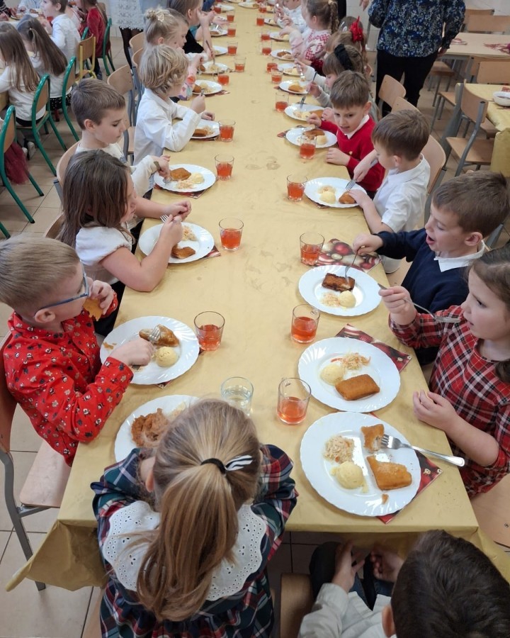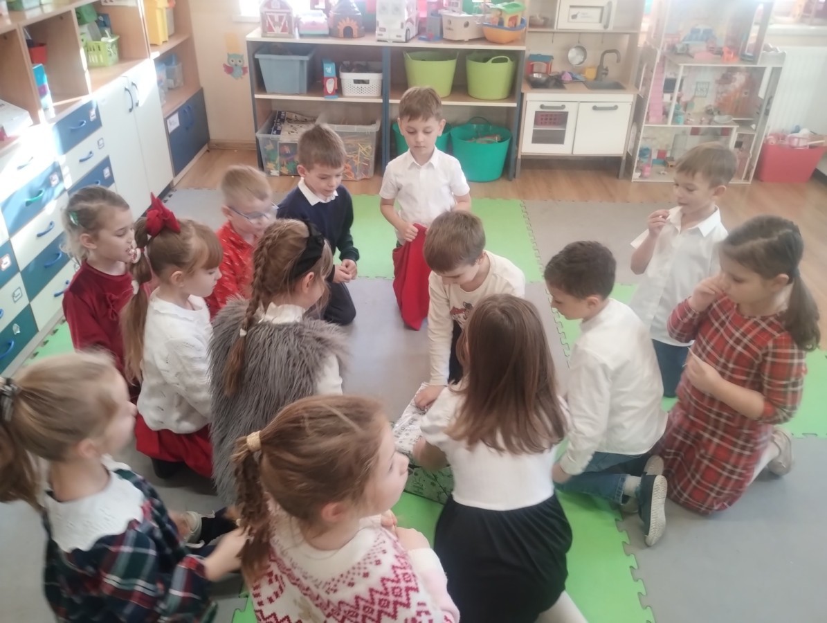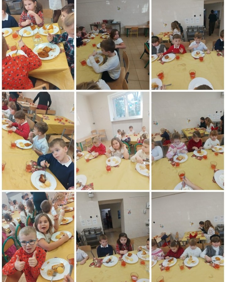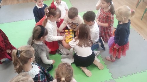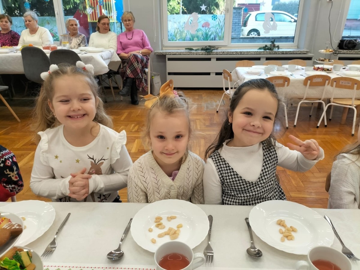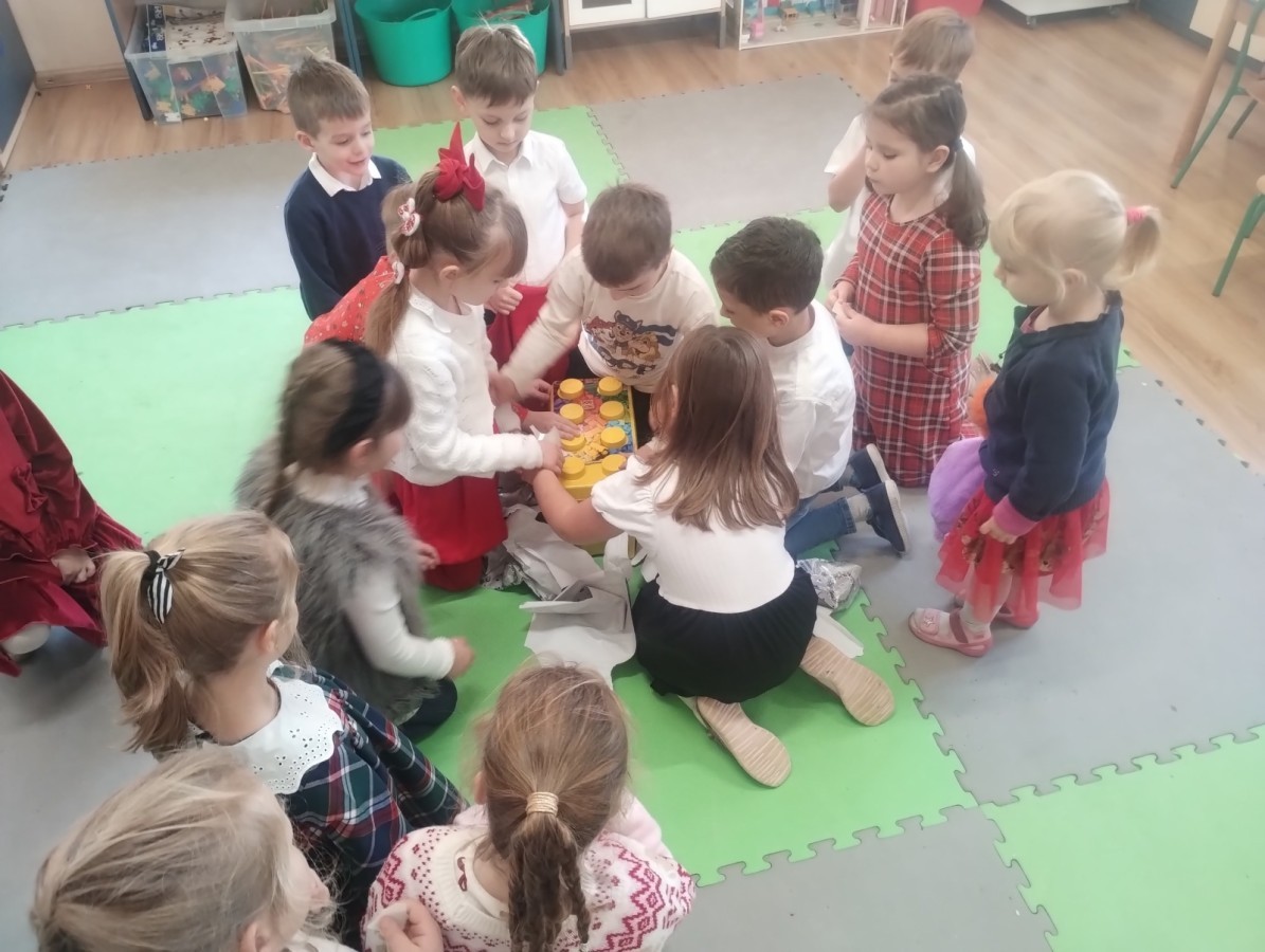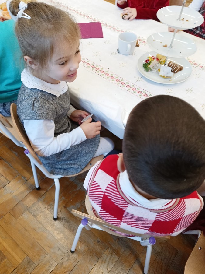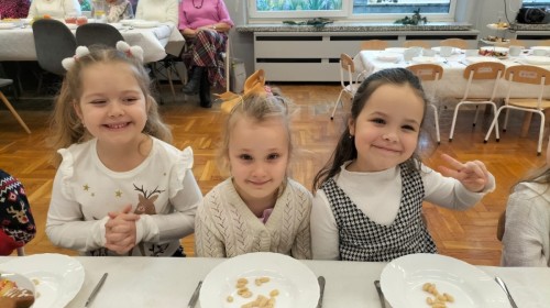 Przy świątecznym stole, w ciepłej i radosnej atmosferze, dzieci wspólnie kolędowały, składały sobie życzenia oraz dzieliły się opłatkiem.